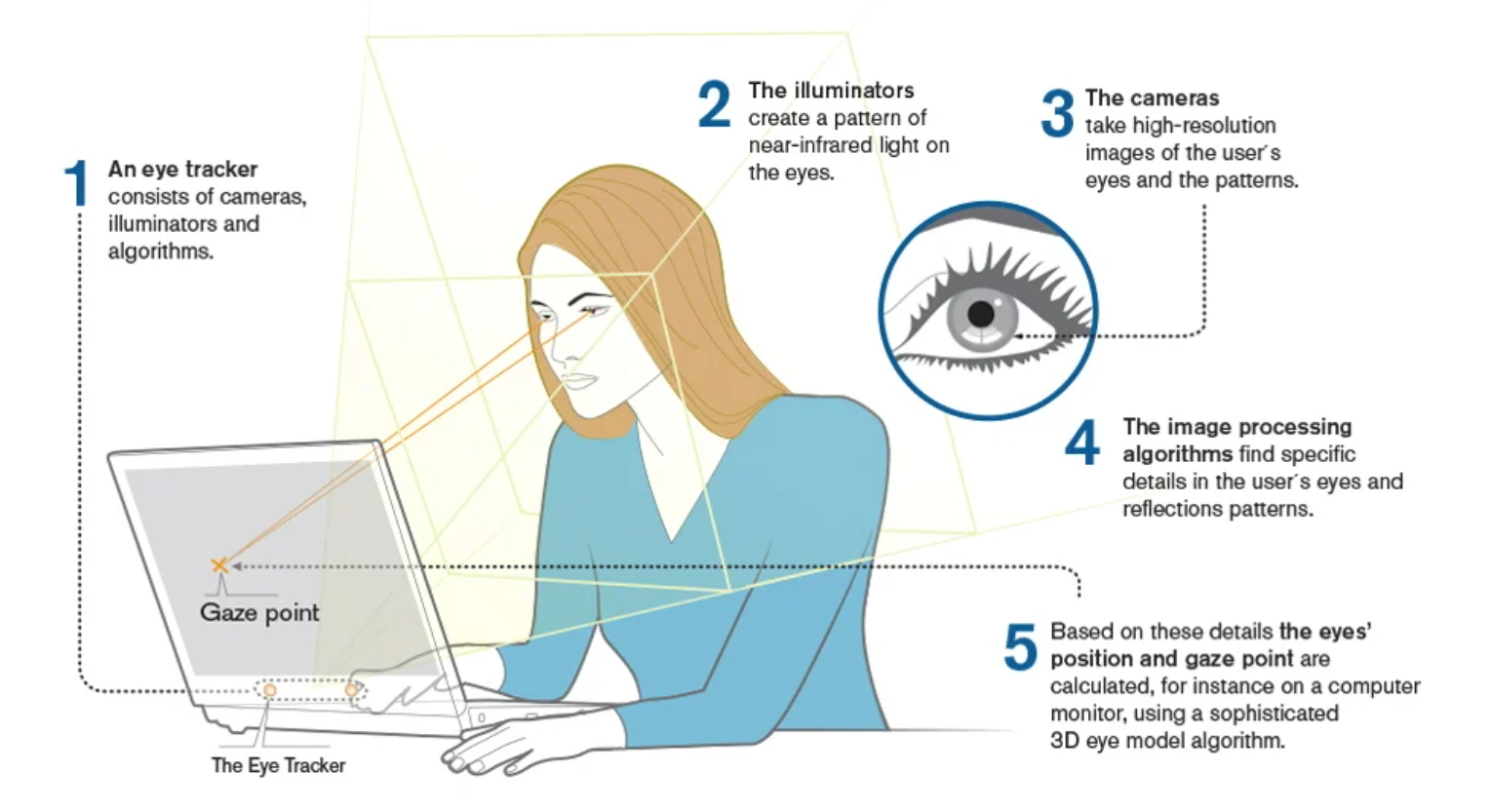 Nello specifico, l’eye tracking ci permette di comprendere la posizione e la durata di questa osservazione, per fornire questo dato, la maggior parte degli eyetracker in commercio si avvalgono di una telecamera ad infrarossi e un software dedicato.