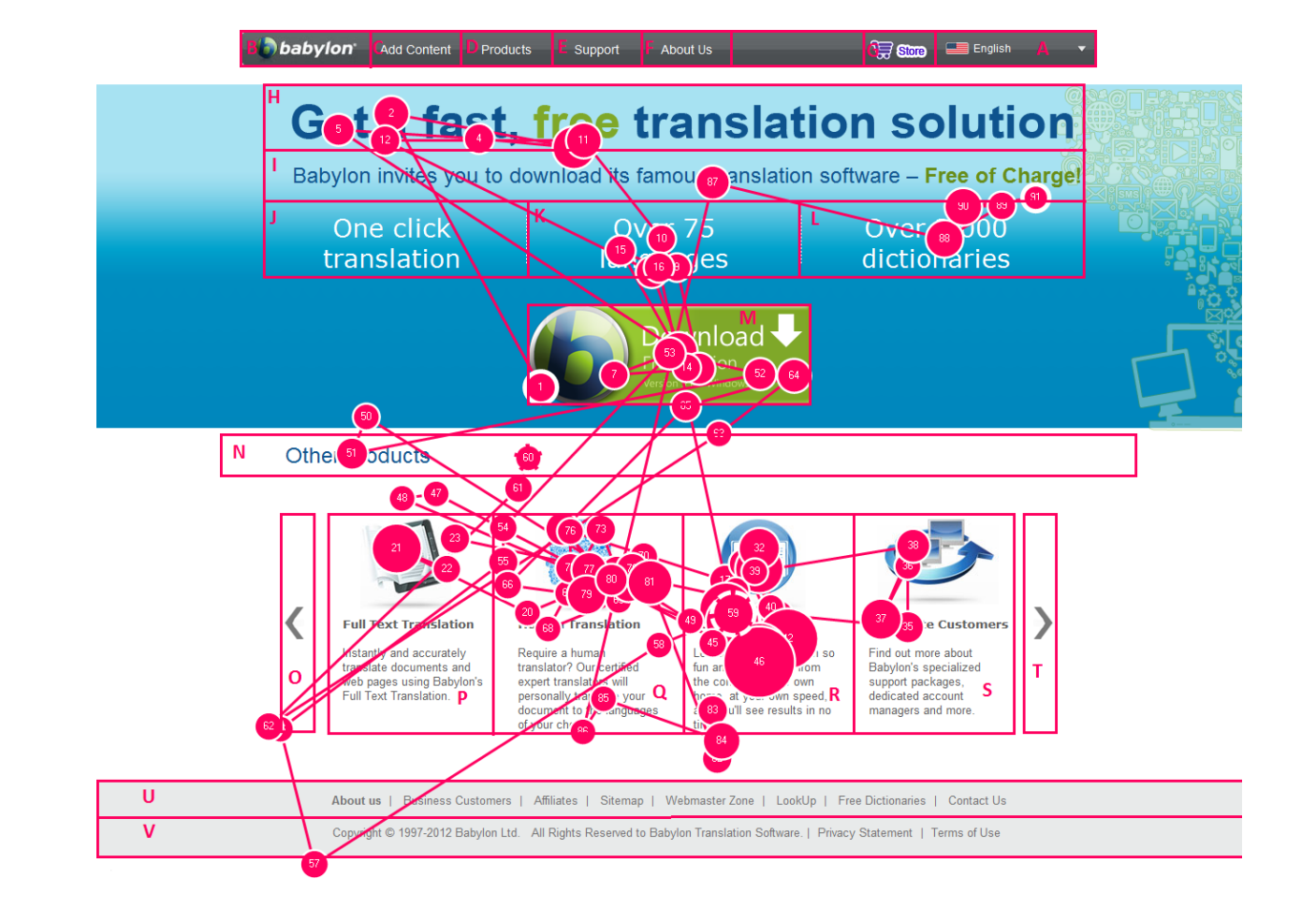 Da queste metriche possiamo poi ricostruire diverse visualizzazioni che possono servire a rappresentare dei dati piuttosto complessi in modo esplicativo per i clienti. Gli esempi principali sono delle rappresentazioni in formato di “mappa di calore” simili a quelli generati per le analytics. Oppure delle visualizzazioni focalizzate sulla sequenza come i gaze plot (o scan path) che mostrano l’ordine delle fissazioni effettuate dall’utente durante tutto il tempo di esposizione allo stimolo.